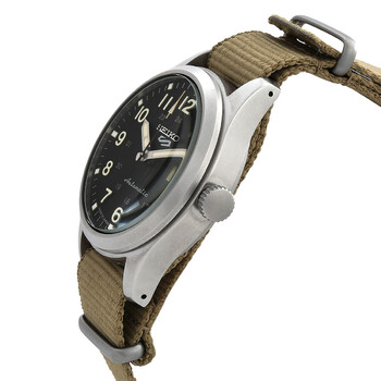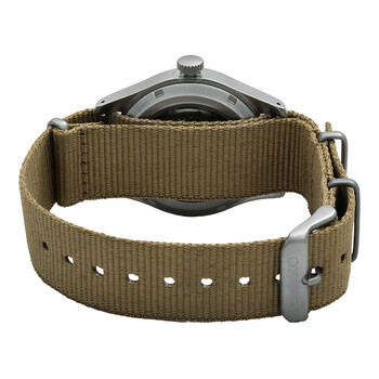 Silver-tone stainless steel case with a beige nylon strap. Fixed silver-tone stainless steel bezel. Black dial with silver-tone hands and Arabic numeral hour markers. Minute markers around the outer rim. Dial Type: Analog. Luminescent hands and markers. Day of the week and date display at the 3 o'clock position. Seiko Caliber 4R36 Automatic movement, containing 24 Jewels, bitting at 21600 vph, and has a power reserve of approximately 41 hours. Scratch resistant Hardlex crystal. Pull / push crown. Transparent case back. Round case shape, case size: 39.4 mm. Water resistant at 100 meters / 330 feet. Functions: date, day, hour, minute, second. 5 Sports Series. Military watch style. Watch label: Japan Movt. Seiko 5 Sports Automatic Black Dial Men's Watch SRPG35.