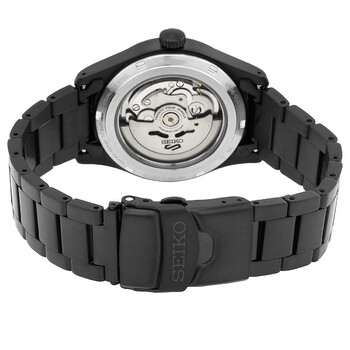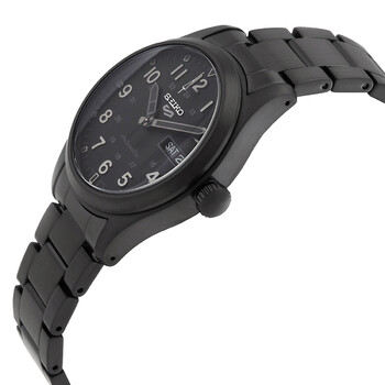 Black stainless steel case and bracelet. Fixed black stainless steel bezel. Black dial with black hands and Arabic numeral hour markers. Minute markers around the outer rim. Dial Type: Analog. Luminescent hands and markers. Day of the week and date display at the 3 o'clock position. Seiko Caliber 4R36 Automatic movement, containing 24 Jewels, bitting at 21600 vph, and has a power reserve of approximately 41 hours. Scratch resistant Hardlex crystal. Transparent case back. Round case shape, case size: 39.4 mm, case thickness: 13.1 mm. Band width: 20 mm. Deployment with push button release clasp. Water resistant at 100 meters / 330 feet. Functions: date, day, hour, minute, second. 5 Sports Series. Casual watch style. Watch label: Japan Movt. Seiko 5 Sports Automatic Black Dial Men's Watch SRPJ09K1.
