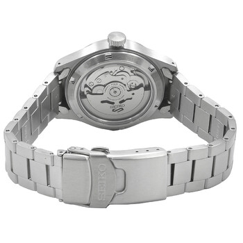 Silver-tone stainless steel case and bracelet. Fixed silver-tone stainless steel bezel. Black dial with silver-tone hands and Arabic numeral hour markers. Minute markers around the outer rim. Dial Type: Analog. Luminescent hands and markers. Day of the week and date display at the 3 o'clock position. Seiko Caliber 4R36 Automatic movement, containing 24 Jewels, bitting at 21600 vph, and has a power reserve of approximately 41 hours. Scratch resistant curved Hardlex crystal. Transparent case back. Round case shape, case size: 36.4 mm, case thickness: 12.5 mm. Band width: 18 mm. Deployment with push button release clasp. Water resistant at 100 meters / 330 feet. Functions: date, day, hour, minute, second. 5 Sports Series. Sport watch style. Watch label: Japan Movt. Seiko 5 Sports Automatic Black Dial Men's Watch SRPJ81K1.