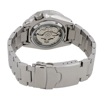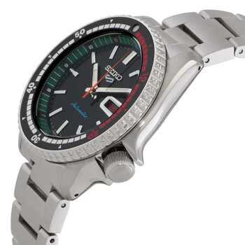 Silver-tone stainless steel case and bracelet. Uni-directional rotating silver-tone with black inlaid ring stainless steel bezel. Black dial with silver-tone hands and index hour markers. Minute markers around the outer rim. Dial Type: Analog. Luminescent hands and markers. Day and date display at the 3 o'clock position. Seiko Caliber 4R36 Automatic movement, containing 24 Jewels, bitting at 21600 vph, and has a power reserve of approximately 41 hours. Scratch resistant mineral crystal. Pull / push crown. Transparent see through case back. Round case shape, case size: 42.5 mm, case thickness: 13.4 mm. Band width: 22 mm. Three-fold with secure lock clasp. Water resistant at 100 meters / 330 feet. Functions: date, day, hour, minute, second. 5 Sports Series. Sport watch style. Watch label: Japan Movt. Seiko 5 Sports Automatic Black Dial Men's Watch SRPK13K1.