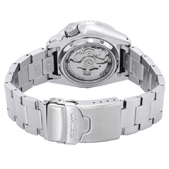 Stainless steel case with a stainless steel bracelet. Uni-directional rotating stainless steel bezel with an inlaid blue ring. Blue dial with luminous silver-tone hands and dot hour markers. Minute markers around the outer rim. Dial Type: Analog. Luminescent hands and markers. Date display at the 3 o'clock position. Automatic movement. Scratch resistant Hardlex crystal. Transparent case back. Round case shape. Case size: 42.5 mm. Case thickness: 13.4 mm. Band width: 22 mm. Fold over with a push button release clasp. Water resistant at 100 meters / 330 feet. Functions: date, day, hour, minute, second. Seiko 5 Sports Series. Sport watch style. Seiko 5 Sports Automatic Blue Dial Men's Watch SRPD51K1.