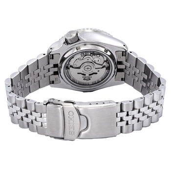 Silver-tone stainless steel case and bracelet. Uni-directional rotating silver-tone stainless steel bezel with an inlaid blue and black ring. Blue dial with silver-tone hands and index hour markers. Minute markers around the outer rim. Dial Type: Analog. Luminescent hands and markers. Date display at the 3 o'clock position. Seiko Caliber 4R34 Automatic movement, containing 24 Jewels, bitting at 21600 vph, and has a power reserve of approximately 41 hours. Scratch resistant Hardlex crystal. Transparent case back. Round case shape, case size: 42.5 mm, case thickness: 13.6 mm. Band width: 22 mm. Fold over clasp with a safety release. Water resistant at 100 meters / 330 feet. Functions: date, GMT, hour, minute, second. 5 Sports Series. Sport watch style. Watch label: Japan Movt. Seiko 5 Sports Automatic Blue Dial Men's Watch SSK003K1.