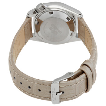 Stainless steel case with a taupe leather strap. Fixed stainless steel bezel. Brown dial with luminous hands and dot hour markers. Minute markers around the outer rim. Dial Type: Analog. Luminescent hands and markers. Day of the week and date display at the 3 o'clock position. Calibre: 2R06 automatic movement with a 41-hour power reserve. Scratch resistant Hardlex crystal. Pull / push crown. Solid case back. Round case shape. Case size: 28 mm. Case thickness: 11.2 mm. Band width: 14 mm. Tang clasp. Water resistant at 100 meters / 330 feet. Functions: date, day, hour, minute, second. 5 Sports Series. Sport watch style. Watch label: Japan Movt. Seiko 5 Sports Automatic Brown Dial Ladies Watch SRE005K1.