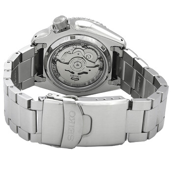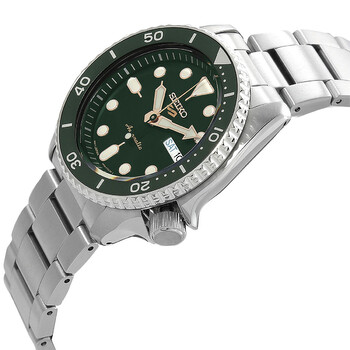 Silver-tone stainless steel case and bracelet. Uni-directional rotating green stainless steel bezel. Green dial with rose gold-tone hands and index hour markers. Minute markers around the outer rim. Dial Type: Analog. Luminescent hands and markers. Day of the week and date display at the 3 o'clock position. Seiko Caliber 4R36 Automatic movement, containing 24 Jewels, bitting at 21600 vph, and has a power reserve of approximately 41 hours. Transparent see through case back. Round case shape, case size: 42.5 mm. Fold over clasp with a safety release. Water resistant at 100 meters / 330 feet. Functions: date, day, hour, minute, second. Seiko 5 Sports Series. Dive watch style. Watch label: Japan Movt. Seiko Seiko 5 Sports Automatic Green Dial Men's Watch SRPD63.