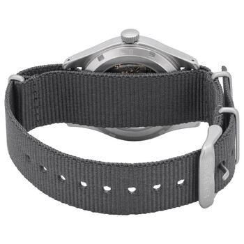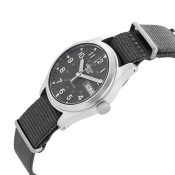 Silver-tone stainless steel case with a grey nylon strap. Fixed silver-tone stainless steel bezel. Grey dial with silver-tone hands and Arabic numeral hour markers. Minute markers around the outer rim. Dial Type: Analog. Luminescent hands and markers. Date display at the 3 o'clock position. Seiko Caliber 4R36 Automatic movement, containing 24 Jewels, bitting at 21600 vph, and has a power reserve of approximately 41 hours. Scratch resistant Hardlex crystal. Pull / push crown. Transparent see through case back. Round case shape, case size: 39.4 mm, case thickness: 13.2 mm. Tang clasp. Water resistant at 100 meters / 330 feet. Functions: date, day, hour, minute, second. 5 Sports Series. Sport watch style. Watch label: Japan Movt. Seiko 5 Sports Automatic Grey Dial Men's Watch SRPG31K1.