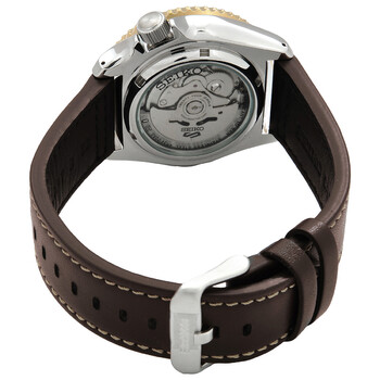 Silver-tone stainless steel case with a brown leather strap. Rotating black and dark brown ceramic bezel. Black dial with gold-tone hands and dots hour markers. Minute markers around the outer rim. Dial Type: Analog. Luminescent hands and markers. Date display at the 3 o'clock position. Seiko Caliber 4R34 Automatic movement, containing 24 Jewels, bitting at 21600 vph, and has a power reserve of approximately 41 hours. Scratch resistant Hardlex crystal. Transparent see through case back. Round case shape, case size: 42.5 mm, case thickness: 13.6 mm. Band width: 22 mm. Tang clasp. Water resistant at 100 meters / 330 feet. Functions: date, GMT, hour, minute, second. 5 Sports Series. Sport watch style. Watch label: Japan Movt. Item Variations: SSK036K1. Seiko 5 Sports SKX GMT Automatic Black Dial Men's Watch SSK036.