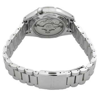 Silver-tone stainless steel case and bracelet. Fixed silver-tone stainless steel bezel. Ivory dial with silver-tone hands and index hour markers. Minute markers around the outer rim. Dial Type: Analog. Luminescent hands and markers. Day of the week and date display at the 3 o'clock position. Seiko Caliber 4R36 Automatic movement, containing 24 Jewels, bitting at 21600 vph, and has a power reserve of approximately 41 hours. Scratch resistant curved Hardlex crystal. Transparent case back. Round case shape, case size: 37.4 mm, case thickness: 12.5 mm. Band width: 18 mm. Deployment with push button release clasp. Water resistant at 100 meters / 330 feet. Functions: date, day, hour, minute, second. 5 Sports Series. Sport watch style. Watch label: Japan Movt. Seiko 5 Sports SNXS Automatic Ivory Dial Men's Watch SRPK91K1.