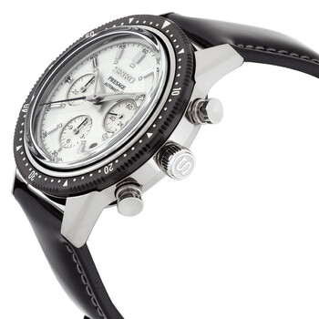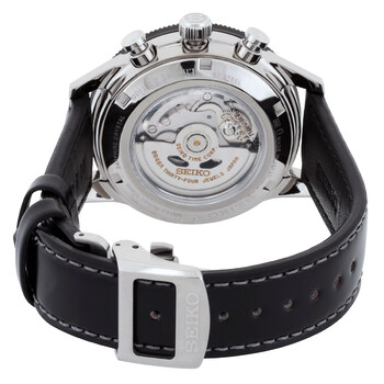 Silver-tone stainless steel case with a black leather strap. Black stainless steel bezel. Champagne dial with silver-tone hands and index hour markers. Minute markers around the outer rim. Dial Type: Analog. Luminescent hands and markers. Date display between 4 and 5 o'clock position. Chronograph - three sub-dials displaying: 60 second, 30 minute and 12 hour. Seiko Caliber 8R48 automatic movement with a 45-hour power reserve. Scratch resistant sapphire crystal. Transparent see through case back. Round case shape, case size: 42.3 mm. Deployment with push button release clasp. Water resistant at 100 meters / 330 feet. Functions: chronograph, date, hour, minute, second. Additional Info: l.e. 1000 units. Presage Luxe Series. Casual watch style. Watch label: Japan Made. Seiko 55th Anniversary Limited Edition Presage Luxe Chronograph Automatic Men's Watch SRQ031.
