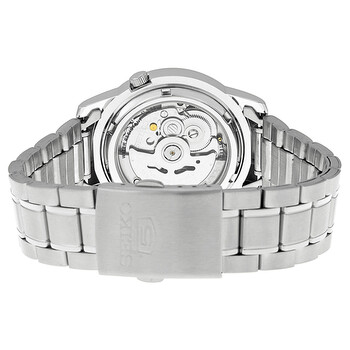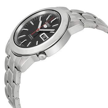 Silver-tone stainless steel case and bracelet. Fixed silver-tone stainless steel bezel. Black dial with luminous silver-tone hands and index hour markers. Minute markers around the outer rim. Dial Type: Analog. Luminescent hands and markers. Day of the week and date display at the 3 o'clock position. Seiko Caliber 7S26 Automatic movement, based upon Seiko 7002, containing 21 Jewels, bitting at 21600 vph, and has a power reserve of approximately 40 hours. Scratch resistant Hardlex crystal. Pull / push crown. Skeleton case back. Round case shape, case size: 38 mm, case thickness: 10 mm. Band width: 18 mm. Deployment with push button release clasp. Water resistant at 30 meters / 100 feet. Functions: date, day, hour, minute, second. Casual watch style. Watch label: Japan Movt. Seiko Automatic Black Dial Stainless Steel Men's Watch SNKE53.