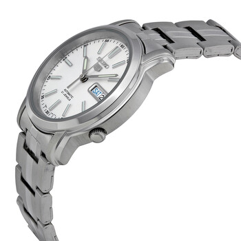 Stainless steel case with a stainless steel bracelet. Fixed stainless steel bezel. White dial with luminous silver-tone hands and index hour markers. Minute markers around the outer rim. Dial Type: Analog. Luminescent hands and markers. Day of the week and date display at the 3 o'clock position. Seiko caliber 7S36 automatic movement, containing 21 Jewels, bitting at 21600 vph, and has a power reserve of approximately 40 hours. Scratch resistant Hardlex crystal. Pull / push crown. Transparent case back. Round case shape. Case size: 38 mm. Case thickness: 11 mm. Band width: 18 mm. Band length: 8.25 inches. Fold over clasp with a push button release. Water resistant at 30 meters / 100 feet. Functions: date, day, hour, minute, second. Casual watch style. Watch label: Japan Movt. Seiko Automatic White Dial Stainless Steel Men's Watch SNKL75.