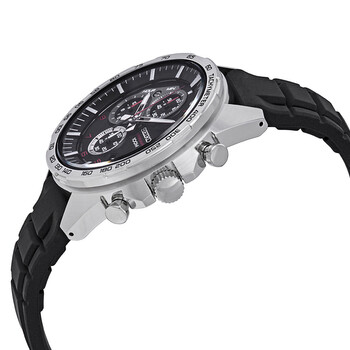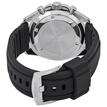 Stainless steel case with a black rubber strap. Fixed stainless steel bezel showing tachymeter markings. Black dial with luminous silver-tone hands and index hour markers. Minute markers around the outer rim. Dial Type: Analog. Luminescent hands and markers. Date display between the 4 and 5 o'clock positions. Chronograph - three sub-dials displaying: 60 second, 60 minute and 12 hour. Seiko caliber 8T67 quartz movement. Scratch resistant Hardlex crystal. Pull / push crown. Solid case back. Round case shape. Case size: 44 mm. Case thickness: 13 mm. Band width: 22 mm. Tang clasp. Water resistant at 100 meters / 330 feet. Functions: chronograph, tachymeter, date, hour, minute, second. Sport watch style. Watch label: Japan Movt. Seiko Chronograph Black Dial Black Rubber Men's Watch SSB325P1.