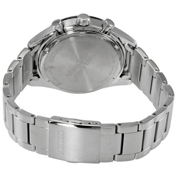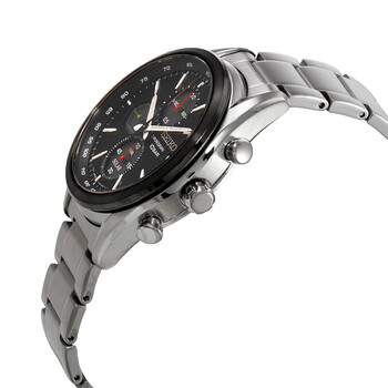 Stainless steel case with a stainless steel bracelet. Fixed black-plated bezel. Black dial with luminous silver-tone hands and index hour markers. Minute markers. Tachymeter markings around the outer rim. Dial Type: Analog. Luminescent hands and markers. Date display at the 3 o'clock position. Chronograph - three sub-dials displaying: 60 second, 60 minute and 1/20th of a second. Seiko caliber V176 eco-drive movement. Scratch resistant sapphire crystal. Pull / push crown. Solid case back. Round case shape. Case size: 41 mm. Case thickness: 12 mm. Band width: 22 mm. Deployment clasp with a push button release. Water resistant at 100 meters / 330 feet. Functions: chronograph, date, hour, minute, second, tachymeter. Chronograph Series. Casual watch style. Watch label: Japan Movt. Seiko Chronograph Black Dial Stainless Steel Men's Watch SSC803.