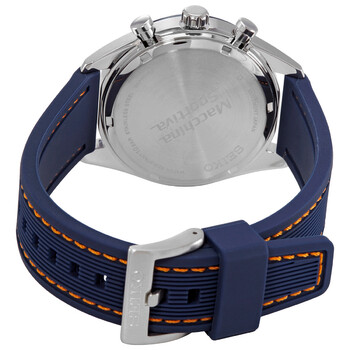 SSC775P1. Silver-tone stainless steel case with a blue silicone strap. Fixed blue-tone stainless steel bezel. Blue dial with luminous silver-tone dauphine-style hands and index hour markers. Minute markers. Tachymeter markings around the outer rim. Dial Type: Analog. Luminescent hands and markers. Date display at the 3 o'clock position. Chronograph - three sub-dials displaying: split time 1/20 second, small second and 60 minute. Seiko Caliber V176 solar quartz movement. Scratch resistant sapphire crystal. Pull / push crown. Solid case back. Round case shape, case size: 41.4 mm, case thickness: 12.1 mm. Band width: 20 mm. Tang clasp. Water resistant at 100 meters / 330 feet. Functions: date, hour, minute, second, tachymeter, solar, 6 months on full charge. Chronograph Series. Sport watch style. Watch label: Japan Movt. Seiko Chronograph Blue Dial Men's Watch SSC775P1.