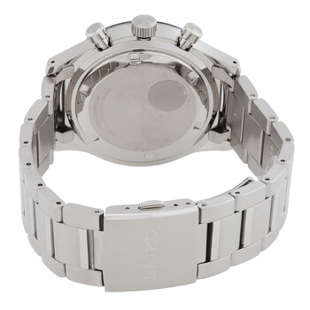 Silver-tone stainless steel case and bracelet. Fixed blue stainless steel bezel. Blue dial with silver-tone hands and index hour markers. Minute markers around the outer rim. Dial Type: Analog. Luminescent hands and markers. Date display between 4 and 5 o'clock position. Chronograph - three sub-dials displaying: 60 minute, 60 second, 24 hour. Seiko Caliber 8T63 quartz movement. Scratch resistant Hardlex crystal. Solid case back. Round case shape, case size: 43 mm, case thickness: 11.6 mm. Band width: 22 mm. Fold over clasp with a safety release. Water resistant at 100 meters / 330 feet. Functions: chronograph, date,hour, minute, second. Sport watch style. Watch label: Japan Movt. Seiko Chronograph Quartz Blue Dial Men's Watch SSB445P1.