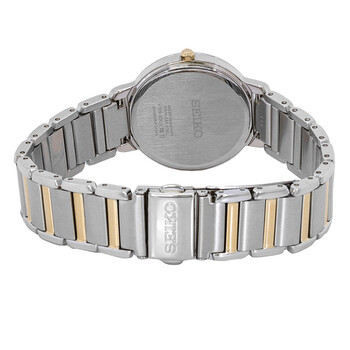 Silver-tone stainless steel case with a two-tone (silver-tone and gold-tone) stainless steel bracelet. Fixed silver-tone bezel with crystal set. Mother of pearl dial with gold-tone hands and Arabic numeral and indicies hour markers. Dial Type: Analog. Seiko Caliber V115 eco-drive movement. Scratch resistant mineral crystal. Pull / push crown. Solid case back. Round case shape, case size: 30.5 mm, case thickness: 6.8 mm. Band width: 12 mm. Deployment clasp. Water resistant at 30 meters / 100 feet. Functions: hour, minute, second. Classic Lady Series. Dress watch style. Watch label: Japan Movt. Seiko Classic Lady Eco-Drive Mother of Pearl Dial Ladies Watch SUP469P1.