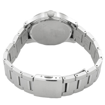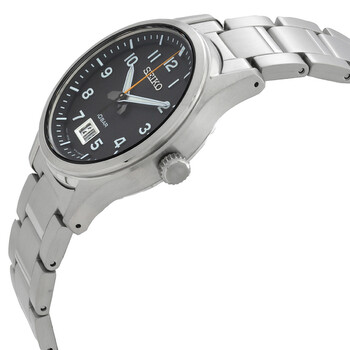Silver-tone stainless steel case and bracelet. Fixed silver-tone stainless steel bezel. Black dial with silver-tone hands and Arabic numeral hour markers. Minute markers around the outer rim. Dial Type: Analog. Date display at the 6 o'clock position. Seiko Caliber 6N76 quartz movement. Scratch resistant sapphire crystal. Solid case back. Round case shape, case size: 39.5 mm, case thickness: 9.78 mm. Band width: 20 mm. Deployment with push button release clasp. Water resistant at 100 meters / 330 feet. Functions: big date, hour, minute, second. Classic Series. Sport watch style. Watch label: Japan Movt. Seiko Classic Quartz Black Dial Men's Watch SUR569P1.
