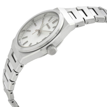 Silver-tone stainless steel case and bracelet. Fixed silver-tone stainless steel bezel. White dial with silver-tone hands and index hour markers. Minute markers around the outer rim. Dial Type: Analog. Date display at the 3 o'clock position. Seiko Caliber 6N42 quartz movement. Scratch resistant sapphire crystal. Solid case back. Round case shape, case size: 34 mm. Band width: 20 mm. Deployment with push button release clasp. Water resistant at 100 meters / 330 feet. Functions: date, hour, minute, second. Classic Series. Casual watch style. Watch label: Japan Movt. Seiko Classic Quartz White Dial Ladies Watch SUR573P1.