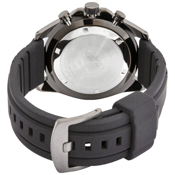 Black-plated stainless steel case with a black silicone strap. Fixed black-plated bezel showing tachymeter markings. Black dial with luminous silver-tone hands and index hour markers. An Arabic numeral appears at the 12 o'clock position. minute markers around the outer rim. Dial Type: Analog. Luminescent hands and markers. Date display between the 4 and 5 o'clock positions. Chronograph - three sub-dials displaying: 60 minute, 60 second, 24 hour. Seiko Caliber 8T63 quartz movement. Scratch resistant Hardlex crystal. Solid case back. Round case shape. Case size: 44 mm. Case thickness: 13 mm. Band width: 20 mm. Tang clasp. Water resistant at 100 meters / 330 feet. Functions: chronograph, tachymeter, date, GMT, second time zone, hour, minute, second. Sport watch style. Watch label: Japan Movt. Seiko Conceptual Chronograph Quartz Black Dial Men's Watch SSB349P1.