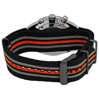 Stainless steel case with a black, grey and orange stripe nylon strap. Fixed black-plated bezel. Grey dial with luminous silver-tone hands and index hour markers. Minute markers. Tachymeter markings around the outer rim. Dial Type: Analog. Luminescent hands and markers. Date display between the 4 and 5 o'clock positions. Chronograph - three sub-dials displaying: 60 second, 60 minute and 24 hour. Quartz movement. Scratch resistant Hardlex crystal. Pull / push crown. Solid case back. Round case shape. Case size: 41 mm. Case thickness: 12.3 mm. Strap width: 22 mm. Tang clasp. Water resistant at 100 meters / 330 feet. Functions: chronograph, tachymeter, date, hour, minute, second. Core Series. Sport watch style. Watch label: Japan Movt. Seiko Core Chronograph Quartz Grey Dial Men's Watch SSB403P1.