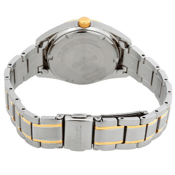 Two-tone (silver-tone and gold-tone) stainless steel case and bracelet. Gold-tone bezel. Mother of pearl dial with gold-tone hands and index hour markers. Dial Type: Analog. Date display at the 3 o'clock position. Seiko Caliber 6N22 quartz movement. Scratch resistant sapphire crystal. Solid case back. Round case shape, case size: 30 mm, case thickness: 8 mm. Deployment clasp. Water resistant at 100 meters / 330 feet. Functions: date, hour, minute, second. Core Series. Watch label: Japan Movt. Seiko Core Quartz Ladies Watch SUR636P1.