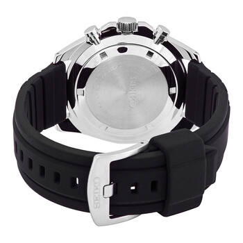 Stainless steel case with a black rubber strap. Fixed black ion-plated bezel showing tachymeter markings. Black dial with luminous silver-tone hands and index hour markers. An Arabic numeral appears at the 12 o'clock position. Minute markers around the outer rim. Dial Type: Analog. Luminescent hands. Date display between 4 and 5 o'clock position. Chronograph - three sub-dials displaying: 60 second, 30 minute and 12-24 hours. Seiko caliber 8T63 quartz movement. Scratch resistant Hardlex crystal. Pull / push crown. Solid case back. Round case shape. Case size: 43.9 mm. Case thickness: 12 mm. Band width: 20 mm. Tang clasp. Water resistant at 100 meters / 330 feet. Functions: chronograph, tachymeter, date, hour, minute, second. Sport watch style. Watch label: Japan Movt. Seiko Chronograph Quartz Black Dial Men's Watch SSB347.