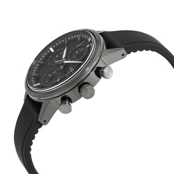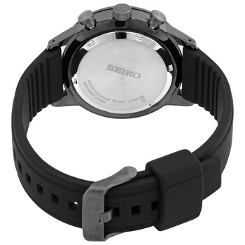Black titanium case with a black silicone strap. Fixed black titanium bezel. Black dial with luminous gunmetal hands and index hour markers. Minute markers. Tachymeter markings around the outer rim. Dial Type: Analog. Luminescent hands and markers. Date display between the 4 and 5 o'clock positions. Chronograph - three sub-dials displaying: 60 small second, 60 minute and 12 hour. Seiko Caliber 8T67 quartz movement. Scratch resistant Hardlex crystal. Pull / push crown. Solid case back. Round case shape, case size: 41 mm, case thickness: 14.2 mm. Band width: 20 mm. Tang clasp. Water resistant at 100 meters / 330 feet. Functions: chronograph, date, hour, minute, second, tachymeter. Casual watch style. Seiko Chronograph Quartz Black Dial Men's Watch SSB393P1.