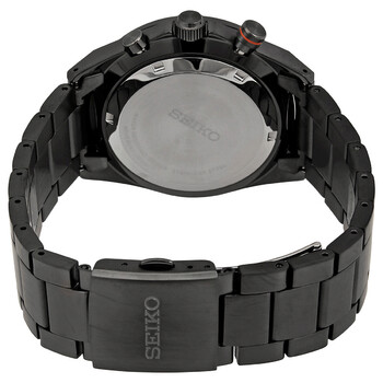 Black-plated stainless steel case and bracelet. Fixed black-plated bezel. Black dial with luminous silver-tone hands and index hour markers. Minute markers. Tachymeter markings around the outer rim. Dial Type: Analog. Luminescent hands and markers. Date display between the 4 and 5 o'clock positions. Chronograph - three sub-dials displaying: 60 second, 60 minute and 24 hour. Quartz movement. Scratch resistant Hardlex crystal. Pull / push crown. Solid case back. Round case shape. Case size: 41 mm. Case thickness: 12.3 mm. Band width: 22 mm. Deployment clasp with a push button release. Water resistant at 100 meters / 330 feet. Functions: chronograph, tachymeter, date, hour, minute, second. Core Series. Sport watch style. Watch label: Japan Movt. Seiko Core Chronograph Quartz Black Dial Men's Watch SSB399P1.