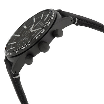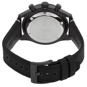Black stainless steel case and bracelet. Fixed black stainless steel bezel. Black dial with silver-tone hands and index hour markers. Minute markers around the outer rim. Dial Type: Analog. Luminescent hands and markers. Between the 4 and 5 o'clock position. Chronograph - three sub-dials displaying: 60 second, 60 minute and 24 hour. Quartz movement. Scratch resistant sapphire crystal. Pull / push crown. Solid case back. Round case shape, case size: 43 mm, case thickness: 11.6 mm. Band width: 22 mm. Tang clasp. Water resistant at 100 meters / 330 feet. Functions: chronograph, date, hour, minute, second. Essential Series. Casual watch style. Seiko Essential Chronograph Quartz Black Dial Men's Watch SSB417.