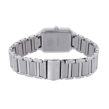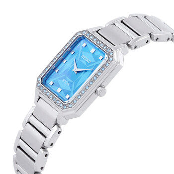 Stainless steel case with a stainless steel bracelet. Fixed stainless steel bezel set with blue crystals. Blue dial with grey hands and pyramid hour markers. Dial Type: Analog. Seiko caliber V115 solar quartz movement. Scratch resistant Hardlex crystal. Pull / push crown. Solid case back. Rectangle case shape. Case dimensions: 25 mm x 35.6 mm. Case thickness: 6.3 mm. Fold over clasp with a safety release. Water resistant at 30 meters / 100 feet. Functions: hour, minute. Essential Series. Dress watch style. Watch label: Japan Movt. Seiko Quartz Crystal Blue Dial Ladies Watch SUP451P1.