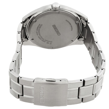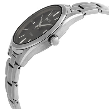 Titanium case and bracelet. Fixed titanium bezel. Black dial with luminous grey dauphine-style hands and index hour markers. Minute markers around the outer rim. Dial Type: Analog. Luminescent hands and markers. Date display at the 3 o'clock position. Seiko Caliber 6N52 quartz movement. Scratch resistant sapphire crystal. Pull / push crown. Solid case back. Round case shape, case size: 40.2 mm, case thickness: 8.4 mm. Deployment with push button release clasp. Water resistant at 100 meters / 330 feet. Functions: date, hour, minute, second. Essentials Series. Casual watch style. Seiko Essentials Quartz Black Dial Men's Watch SUR375P1.