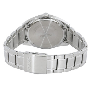 Silver-tone stainless steel case and bracelet. Fixed silver-tone stainless steel bezel. Blue dial with silver-tone hands and index hour markers. Minute markers around the outer rim. Dial Type: Analog. Luminescent hands and markers. Date display at the 3 o'clock position. Quartz movement. Scratch resistant sapphire crystal. Pull / push crown. Solid case back. Round case shape, case size: 40 mm, case thickness: 9 mm. Band width: 20 mm. Deployment with push button release clasp. Water resistant at 100 meters / 330 feet. Functions: date, hour, minute, second. Quartz Series. Casual watch style. Seiko Quartz Blue Dial Men's Watch SUR525.