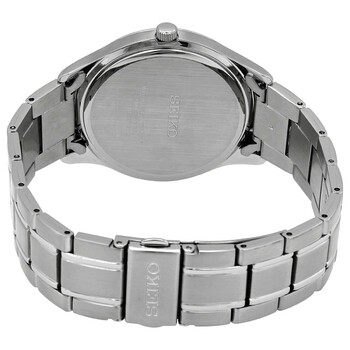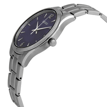 Stainless steel case with a stainless steel bracelet. Fixed stainless steel bezel. Blue dial with silver-tone dauphine-style hands and index hour markers. Arabic numerals appear at the 6 and 12 o'clock positions. Minute markers around the outer rim. Dial Type: Analog. Date display at the 3 o'clock position. Quartz movement. Scratch resistant sapphire crystal. Pull / push crown. Solid case back. Round case shape. Case size: 39 mm. Case thickness: 12 mm. Band width: 20 mm. Fold over clasp with a push button release. Water resistant at 100 meters / 330 feet. Functions: date, hour, minute, second. Noble Series. Casual watch style. Watch label: Japan Movt. Seiko Noble Quartz Blue Dial Stainless Steel Men's Watch SUR419.