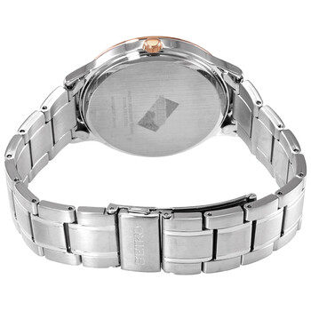 Stainless steel case with a stainless steel bracelet. Fixed rose gold-tone bezel. Brown dial with rose gold-tone hands and index hour markers. Arabic numerals mark the 3, 6, 9 and 12 o'clock positions. Minute markers around the outer rim. Dial Type: Analog. Date display at the 3 o'clock position. Quartz movement. Scratch resistant mineral crystal. Pull / push crown. Solid case back. Round case shape. Case size: 41 mm. Case thickness: 10 mm. Band width: 20 mm. Fold over clasp with a push button release. Water resistant at 100 meters / 330 feet. Functions: date, hour, minute, second. Essentials Series. Casual watch style. Seiko Essentials Quartz Brown Dial Stainless Steel Men's Watch SGEH90. K3G23126