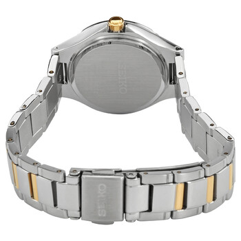 Stainless steel case with a two-tone (silver-tone and yellow gold PVD) stainless steel bracelet. Fixed stainless steel bezel with yellow gold PVD accents. Charcoal sunray dial with yellow gold-tone hands and index hour markers. Minute markers around the outer rim. Dial Type: Analog. Date display at the 3 o'clock position. Seiko caliber 6N22 quartz movement. Scratch resistant Hardlex crystal. Pull / push crown. Solid case back. Round case shape. Case size: 27.4 mm. Fold over clasp with a push button release. Water resistant at 50 meters / 165 feet. Functions: date, hour, minute, second. Essentials Series. Casual watch style. Watch label: Japan Movt. Seiko Essentials Quartz Charcoal Sunray Dial Ladies Watch SUR414.