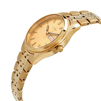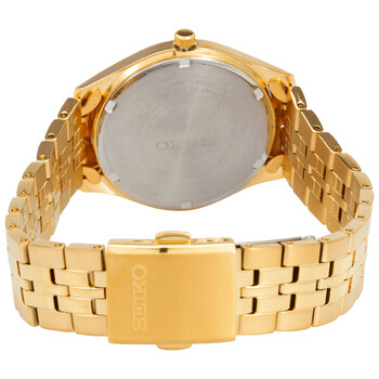 Yellow gold-tone stainless steel case and bracelet. Fixed yellow gold-tone bezel. Gold dial with luminous black hands and index hour markers. Minute markers around the outer rim. Dial Type: Analog. Luminescent hands. Day of the week and date display at the 3 o'clock position. Quartz movement. Scratch resistant Hardlex crystal. Pull / push crown. Solid case back. Round case shape. Case size: 36.9 mm. Fold over clasp with a safety release. Water resistant at 100 meters / 330 feet. Functions: date, day, hour, minute, second. Essentials Series. Dress watch style. Watch label: Japan Movt. Seiko Essentials Quartz Gold Dial Men's Watch SUR434.