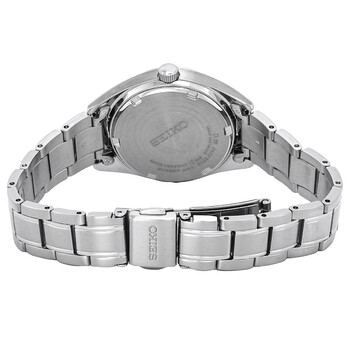 Silver-tone stainless steel case and bracelet. Fixed silver-tone stainless steel bezel. Green dial with silver-tone hands and index hour markers. Minute markers around the outer rim. Dial Type: Analog. Luminescent hands and markers. Date display at the 3 o'clock position. Quartz movement. Scratch resistant sapphire crystal. Pull / push crown. Solid case back. Round case shape, case size: 30 mm, case thickness: 9 mm. Band width: 14 mm. Fold over with double push button release clasp. Water resistant at 100 meters / 330 feet. Functions: date, hour, minute, second. Quartz Series. Casual watch style. Seiko Quartz Green Dial Ladies Watch SUR533.
