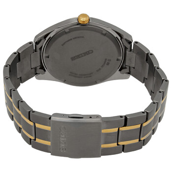 Grey titanium case with a grey titanium bracelet with gold-tone accents. Fixed grey titanium bezel. Green dial with luminous gold-tone dauphine-style hands and index hour markers. Minute markers around the outer rim. Dial Type: Analog. Luminescent hands and markers. Date display at the 3 o'clock position. Seiko caliber 6N52 quartz movement. Scratch resistant sapphire crystal. Pull / push crown. Solid case back. Round case shape. Case size: 40 mm. Case thickness: 8.5 mm. Band width: 20 mm. Deployment clasp with a push button release. Water resistant at 100 meters / 330 feet. Functions: date, hour, minute, second. Classic Series. Casual watch style. Watch label: Japan Movt. Seiko Classic Quartz Green Dial Men's Watch SUR377.