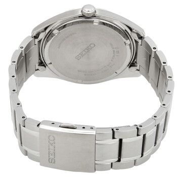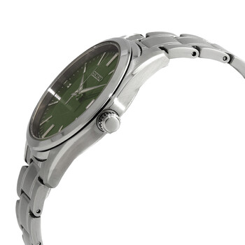 Silver-tone stainless steel case and bracelet. Fixed silver-tone stainless steel bezel. Green dial with silver-tone hands and index hour markers. Minute markers around the outer rim. Dial Type: Analog. Luminescent hands and markers. Date display at the 3 o'clock position. Quartz movement. Scratch resistant sapphire crystal. Pull / push crown. Solid case back. Round case shape, case size: 40 mm, case thickness: 9 mm. Band width: 20 mm. Deployment with push button release clasp. Functions: date, hour, minute, second. Quartz Series. Casual watch style. Seiko Quartz Green Dial Men's Watch SUR527.