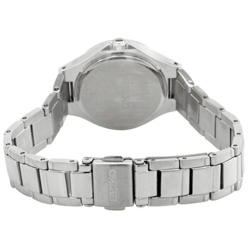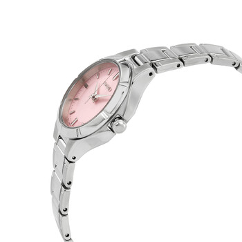 Stainless steel case with a stainless steel bracelet. Fixed stainless steel bezel. Pink dial with silver-tone hands and index hour markers. Minute markers around the outer rim. Dial Type: Analog. Date display at the 3 o'clock position. Seiko caliber 6N22 quartz movement. Scratch resistant sapphire crystal. Pull / push crown. Solid case back. Round case shape. Case size: 27.4 mm. Case thickness: 8 mm. Band width: 5 mm. Fold over clasp with a push button release. Water resistant at 50 meters / 165 feet. Functions: date, hour, minute, second. Essentials Series. Casual watch style. Watch label: Japan Movt. Seiko Essentials Quartz Pink Dial Ladies Watch SUR413.