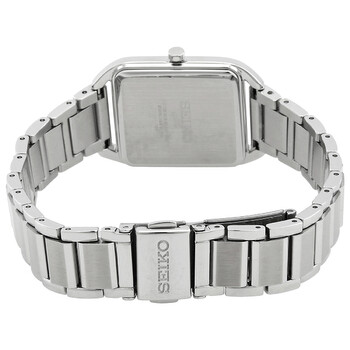 Silver-tone stainless steel case and bracelet. Fixed silver-tone stainless steel bezel. Pink dial with gold-tone hands and index hour markers. Dial Type: Analog. Quartz movement. Scratch resistant Hardlex crystal. Pull / push crown. Solid case back. Rectangle case shape, case size: 26 mm, case thickness: 6.4 mm. Band width: 15 mm. Fold over clasp with a safety release. Water resistant at 50 meters / 165 feet. Functions: hour, minute. Essentials Series. Dress watch style. Seiko Essentials Quartz Pink Dial Ladies Watch SWR077.
