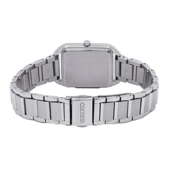 Silver-tone stainless steel case and bracelet. Fixed silver-tone stainless steel bezel. Silver-tone dial with silver-tone hands and index hour markers. Dial Type: Analog. Quartz movement. Scratch resistant Hardlex crystal. Pull / push crown. Solid case back. Rectangle case shape, case size: 26 mm, case thickness: 6.4 mm. Band width: 15 mm. Fold over clasp with a safety release. Water resistant at 50 meters / 165 feet. Functions: hour, minute. Essential Series. Casual watch style. Seiko essential Quartz Silver Dial Ladies Watch SWR073.