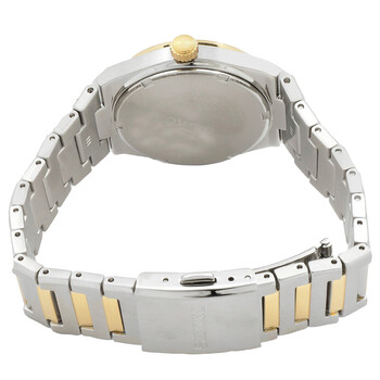 Silver-tone stainless steel case with a two-tone (silver-tone and gold-tone) stainless steel bracelet. Fixed gold-tone stainless steel bezel. White dial with gold-tone hands and index hour markers. Minute markers around the outer rim. Dial Type: Analog. Date display at the 3 o'clock position. Seiko Caliber 6N42 quartz movement. Scratch resistant sapphire crystal. Solid case back. Round case shape, case size: 34 mm. Band width: 20 mm. Deployment with push button release clasp. Water resistant at 100 meters / 330 feet. Functions: date, hour, minute, second. Classic Series. Casual watch style. Watch label: Japan Movt. Seiko Classic Quartz White Dial Two-Tone Ladies Watch SUR578P1.