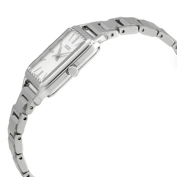Silver-tone stainless steel case and bracelet. Fixed silver-tone stainless steel bezel. White dial with silver-tone hands and index hour markers. Dial Type: Analog. Seiko Caliber 4N30 quartz movement. Scratch resistant Hardlex crystal. Pull / push crown. Solid case back. Square case shape, case size: 26 mm, case thickness: 6.4 mm. Band width: 15 mm. Fold over clasp with a safety release. Water resistant at 50 meters / 165 feet. Functions: hour, minute. Essentials Series. Dress watch style. Watch label: Japan Movt. Seiko Essentials Quartz White Dial Ladies Watch SWR073P1.