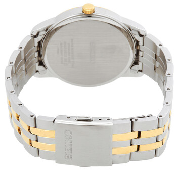 Silver-tone stainless steel case with a two-tone (silver-tone and yellow gold-tone) stainless steel bracelet. Fixed gold-tone stainless steel bezel. White dial with gold-tone dauphine-style hands and index hour markers. Minute markers around the outer rim. Dial Type: Analog. Date display at the 3 o'clock position. Seiko Caliber 6N42 quartz movement. Scratch resistant Hardlex crystal. Pull / push crown. Solid case back. Round case shape, case size: 40 mm, case thickness: 8.3 mm. Three-fold with push button release clasp. Water resistant at 50 meters / 165 feet. Functions: date, hour, minute, second. Essentials Series. Casual watch style. Watch label: Japan Movt. Seiko Essentials Quartz White Dial Men's Watch SUR402P1.