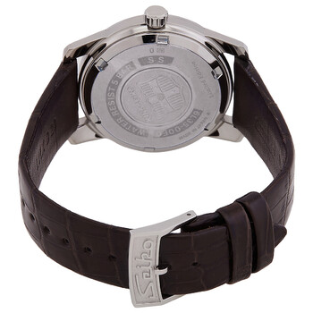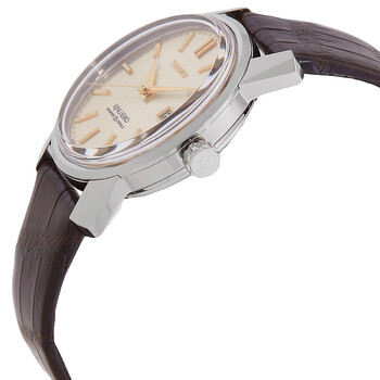 Silver-tone stainless steel case with a brown alligator band. Fixed silver-tone stainless steel bezel. Champagne dial with yellow gold-tone hands and index hour markers. Minute markers around the outer rim. Dial Type: Analog. Date display at the 3 o'clock position. Seiko Caliber 6L35 automatic movement with a 45-hour power reserve. Scratch resistant sapphire crystal. Solid case back. Round case shape, case size: 38 mm. Buckle clasp. Water resistant at 50 meters / 165 feet. Functions: date, hour, minute, second. Additional Info: limited edition. Luxe King Seiko Series. Dress watch style. Watch label: Japan Movt. Seiko Luxe King Seiko Automatic Champagne Dial Unisex Watch SJE087.