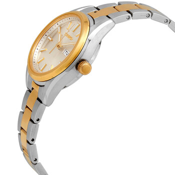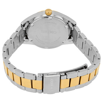 Stainless steel case with a two-tone (silver-tone and yellow gold-tone) stainless steel bracelet. Fixed yellow gold-tone bezel. Gold dial with luminous yellow gold-tone index-style hands and index hour markers. Minute markers around the outer rim. Dial Type: Analog. Luminescent hands and markers. Day of the week and date display at the 3 o'clock position. Quartz movement. Scratch resistant sapphire crystal. Pull / push crown. Solid case back. Round case shape. Case size: 30 mm. Case thickness: 7 mm. Band width: 14 mm. Deployment clasp with a push button release. Water resistant at 100 meters / 330 feet. Functions: date, day, hour, minute, second. Neo Classic Series. Casual watch style. Watch label: Japan Movt. Seiko Neo Classic Quartz Gold Dial Two-tone Ladies Watch SUR354P1.