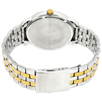 Stainless steel case with a two-tone (silver-tone and yellow gold-tone) stainless steel bracelet. Fixed stainless steel bezel. Silver dial with yellow gold-tone hands and index hour markers. Minute markers around the outer rim. Dial Type: Analog. Date display at the 3 o'clock position. Caliber: 6N42 quartz movement. Scratch resistant Hardlex crystal. Pull / push crown. Solid case back. Round case shape. Case size: 41 mm. Case thickness: 9 mm. Band width: 20 mm. Fold over clasp with a push button release. Water resistant at 100 meters / 330 feet. Functions: date, hour, minute, second. Neo Classic Series. Casual watch style. Seiko Neo Classic Quartz Silver Dial Men's Watch SUR263P1.