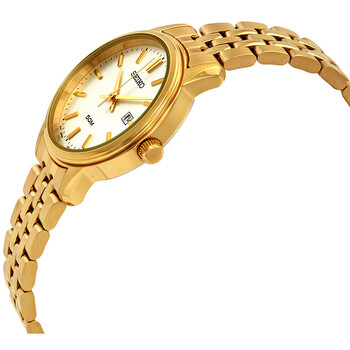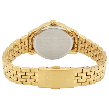Yellow gold-tone stainless steel case and bracelet. Fixed yellow gold-tone bezel. Silver-tone dial with yellow gold-tone hands and index hour markers. Minute markers around the outer rim. Dial Type: Analog. Date display at the 3 o'clock position. Seiko caliber 6N22 quartz movement. Scratch resistant Hardlex crystal. Pull / push crown. Solid case back. Round case shape. Case size: 30 mm. Case thickness: 7 mm. Deployment clasp. Water resistant at 50 meters / 165 feet. Functions: date, hour, minute, second. Casual watch style. Watch label: Japan Movt. Seiko Neo Classic Silver Dial Ladies Watch SUR660P1.