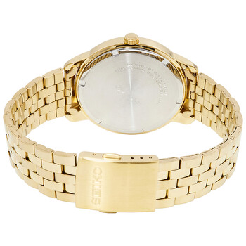 Yellow gold-tone stainless steel case and bracelet. Fixed yellow gold-tone bezel. Silver dial with yellow gold-tone hands and index hour markers. Minute markers around the outer rim. Dial Type: Analog. Date display at the 3 o'clock position. Seiko caliber 6N42 quartz movement. Scratch resistant Hardlex crystal. Pull / push crown. Solid case back. Round case shape. Case size: 41 mm. Case thickness: 9 mm. Band width: 22 mm. Deployment clasp. Water resistant at 100 meters / 330 feet. Functions: date, hour, minute, second. Casual watch style. Watch label: Japan Movt. Seiko Neo Classic Silver Dial Men's Watch SUR264P1.