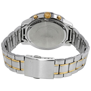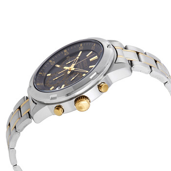 Stainless steel case with a stainless steel bracelet with yellow gold-plated links. Fixed stainless steel bezel. Grey dial with luminous silver-tone hands and index hour markers. Minute markers around the outer rim. Dial Type: Analog. Luminescent hands and markers. Date display between the 4 and 5 o'clock positions. Chronograph - three sub-dials displaying: 60 second, 60 minute and 24 hour. Seiko caliber 4T53 quartz movement. Scratch resistant Hardlex crystal. Solid case back. Round case shape. Case size: 43 mm. Case thickness: 13 mm. Band width: 20 mm. Deployment clasp. Water resistant at 100 meters / 330 feet. Functions: chronograph, date, GMT, second time zone, hour, minute, second. Sport watch style. Watch label: Japan Movt. Seiko Neo Sports Chronograph Grey Dial Men's Watch SKS609P1.
